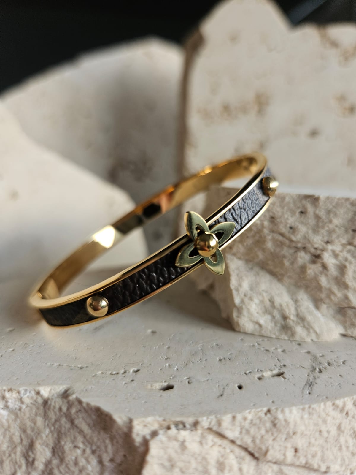 MEET AMBER, A QUALITY STATEMENT PIECE THAT EXCUDES CONFIDENCE AND PLAYFULNESS. THIS DESIGNER INSPIRED BRACELET FEATURES RICH BROWN LEATHER WRAPPED AROUND 18K DOUBLE PLATED GOLD EDGES, ADORNED WITH A DELICATE FLOWER MOTIF PERFECT FOR THE MODERN WOMAN WHO EMBODIES A LOUD AND FUN PERSONALITY WITH A TOUCH OF SPOHISTICATION, AMBER IS IDEAL FOR SPECIAL OCCASSIONS OR ADDING A POP OF GLAMOUR TO EVERYDAY LIFE.
