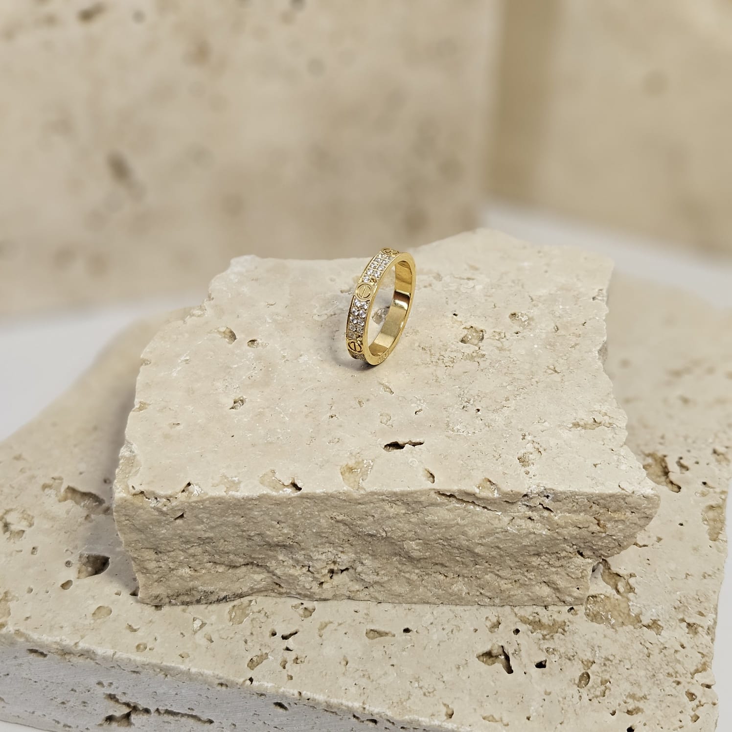 GET READY FOR SIBEL, A STUNNING 18K DOUBLE PLATED GOLD RING THAT EXUDES MODERN SOPHISTICATION. INSPIRED BY DESIGNER LUXURY, THIS EXQUISITE PIECE FEATURES A GOLD BAND ADORNED WITH DIDAMOND ZIRCONIA GEMSTONES AND STRIKING SCREW MARKINGS. A TRULY UNIQUE AND EYE CATHING DESIGN.