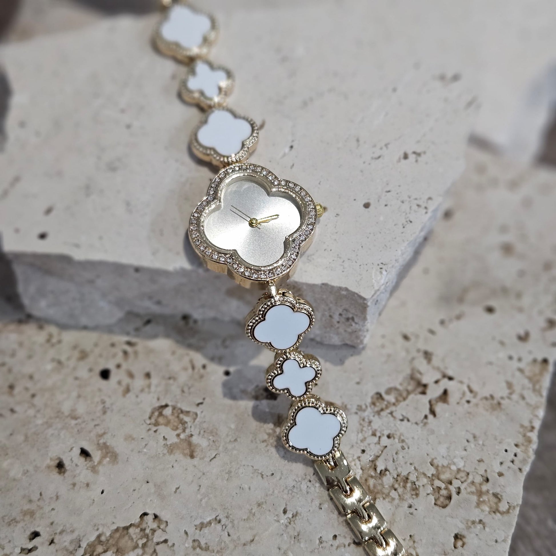 THE 30MM DIAL IS ADORNED WITH DIAMOND ZIRCONIA GEMSTONES, ADDING GLAMOUR TO ITS ALREADY BREATH-TAKING DEISIGN. THE 20MM BAND IS CRAFTED WITH MULTIPLE WHITE QUARTZ CLOVERS, CREATING A COHESIVE AND EYE-CACTCHING LOOK.
